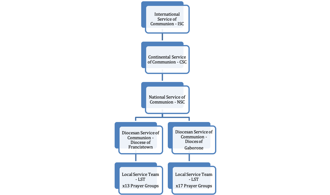 According to article 16 of CHARIS Statues, the general composition of the NSC should consist of representatives from realities and expressions of the current of grace born from the Catholic charismatic renewal. Nonetheless, the current NSC consists of representatives from prayer groups, as it is the only existing reality in Botswana.